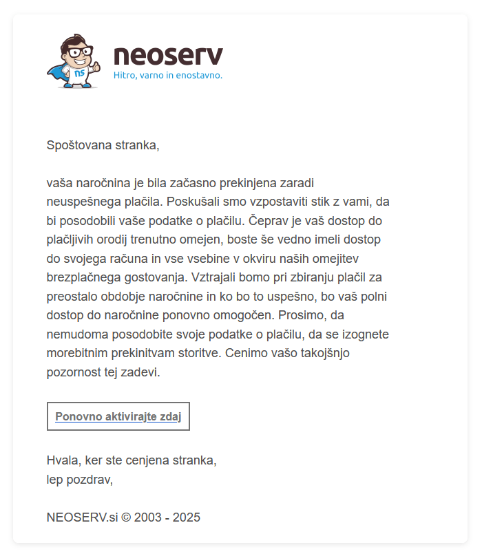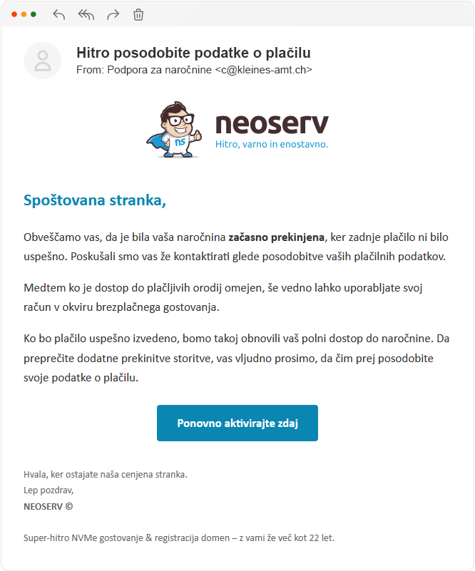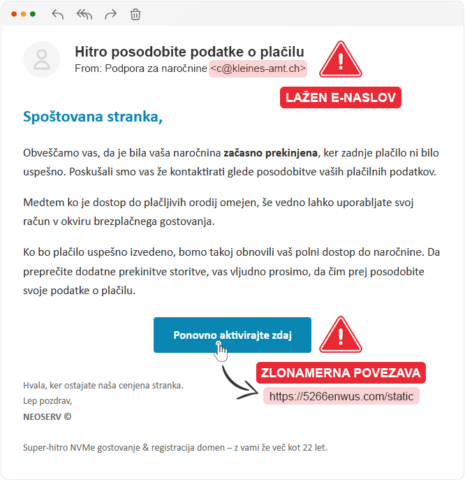Zlonamerna povezava vodi na lažno spletno stran, ki uporablja grafične elemente ponudnika storitev, s čimer želi dajati vtis verodostojnosti. Največkrat posnema prijavno stran z vnosnimi polji, kamor naj bi uporabnik vpisal podatke za prijavo v sistem (npr. v Moj NEOSERV). V resnici pa ponarejena spletna stran podatke posreduje napadalcem.