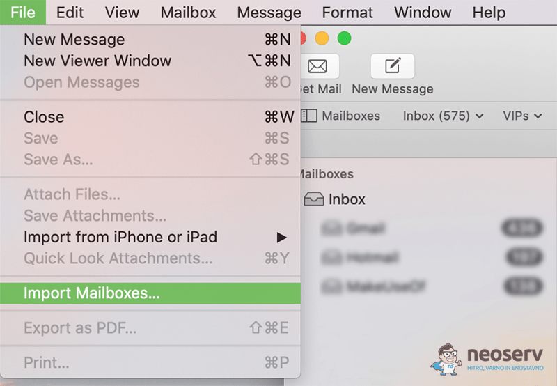 2. V zgornji vrstici menija kliknite File in izberite možnost Import Mailboxes …