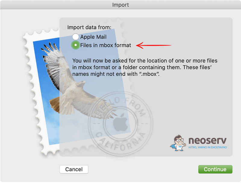 3. V pojavnem oknu izberite možnost Files in mbox format in kliknite na gumb Continue.