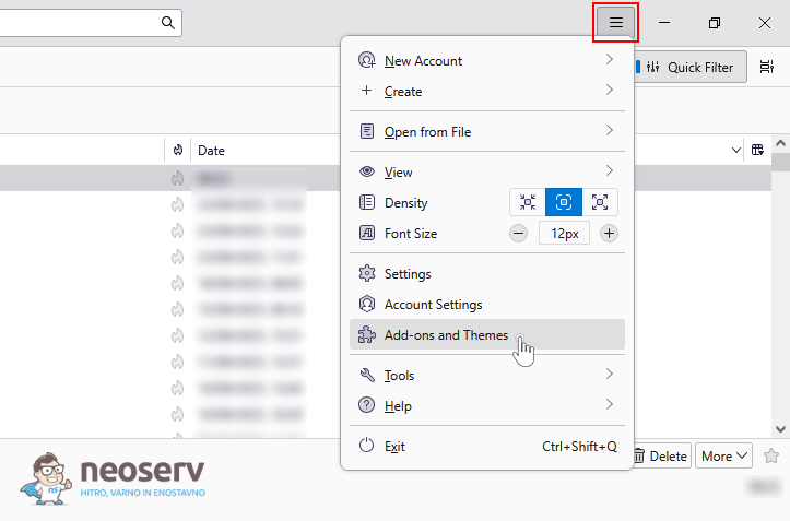 2. S klikom na znak ≡ v desnem zgornjem kotu odprite nastavitve in izberite Add-ons and Themes.