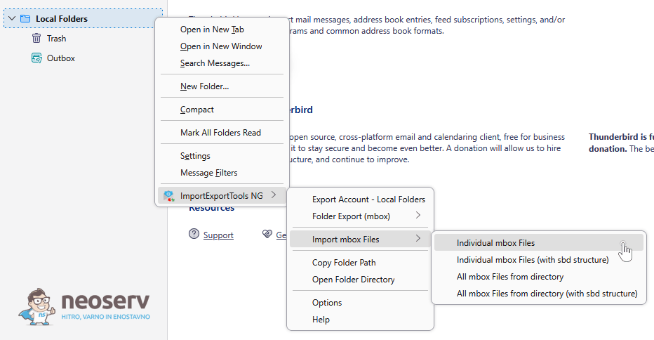 5. Ko je razširitev nameščena, v stranski vrstici z desnim klikom izberite Local Folders → ImportExportTools NG → Import mbox Files -> Individual mbox Files.